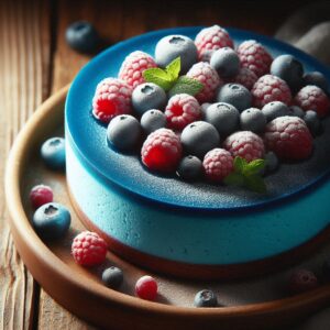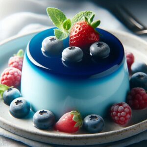 スポンジ、カスタード、生クリーム、そしてアーチャウ茶のゼリーを層にしたデザート。青いゼリーがアクセントになっています。