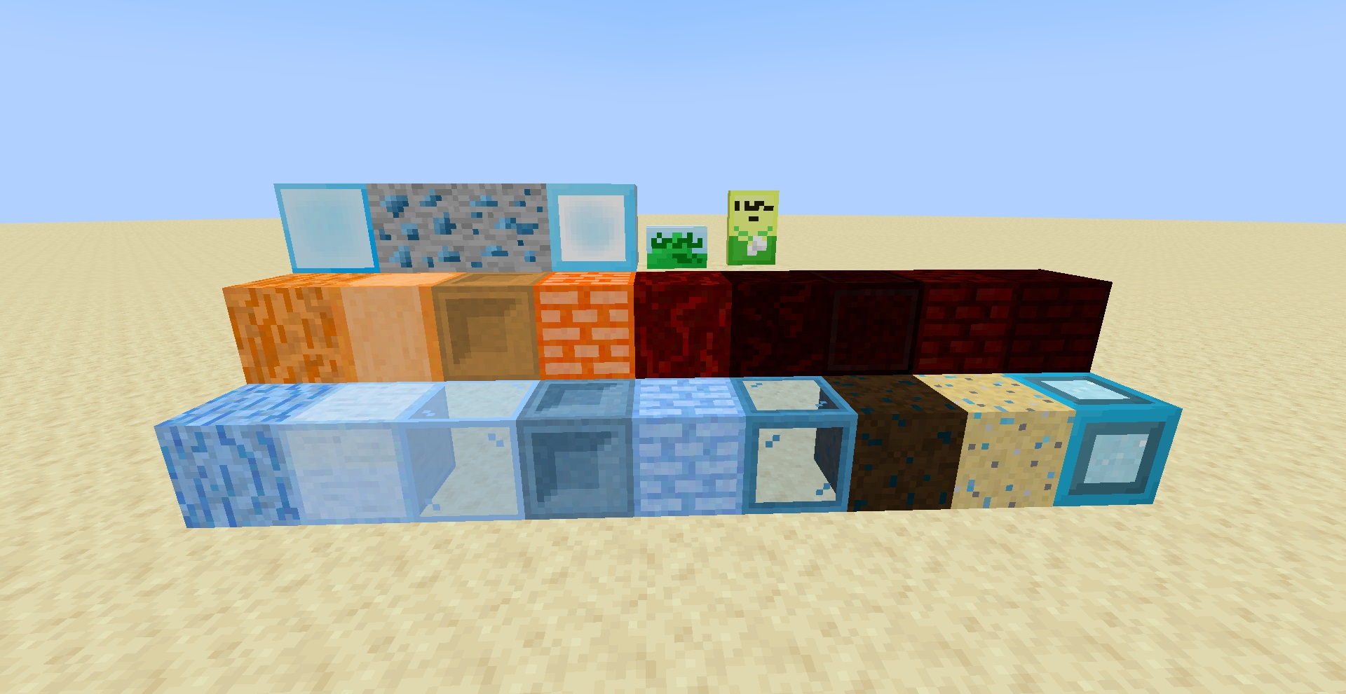 レンガとか、ガラスとかみたいなほとんどは普通のなんともない装飾用ブロックで、とりあえず特殊な機能などはなく、シンプルな建材として使えます。