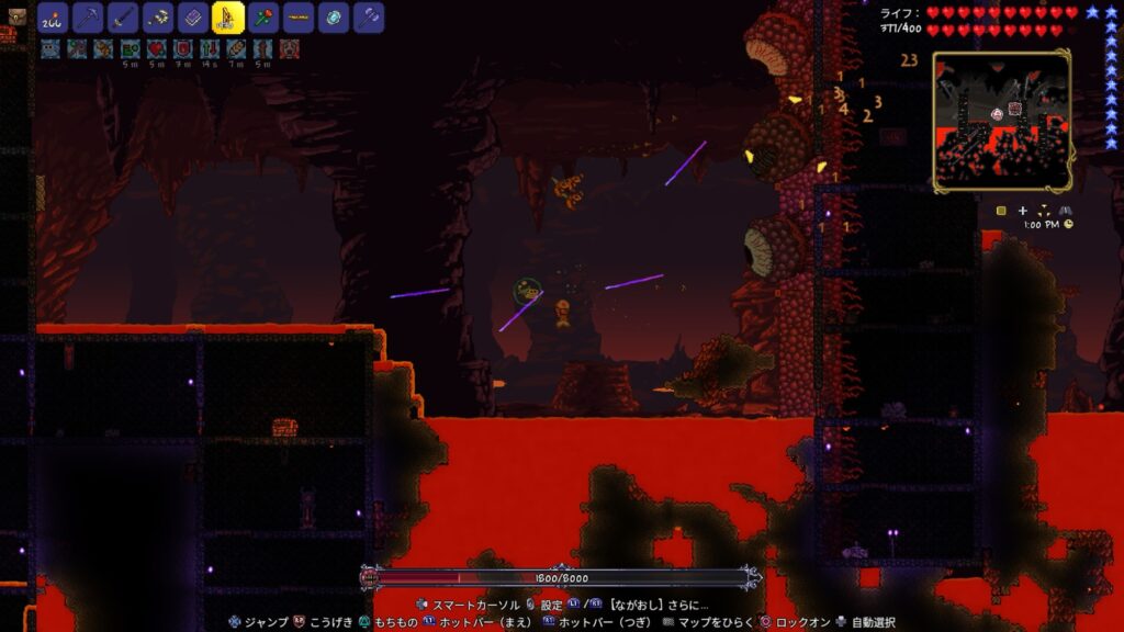 やっぱりこいつは溶岩無効や機動力がないとかなりキツいです。あとペットのハチくんがすごく優秀。「クイーンビー」から入手出来るハチ系のアイテムって序盤だとほんと優秀で助かります
