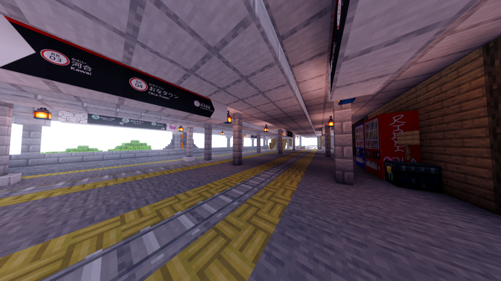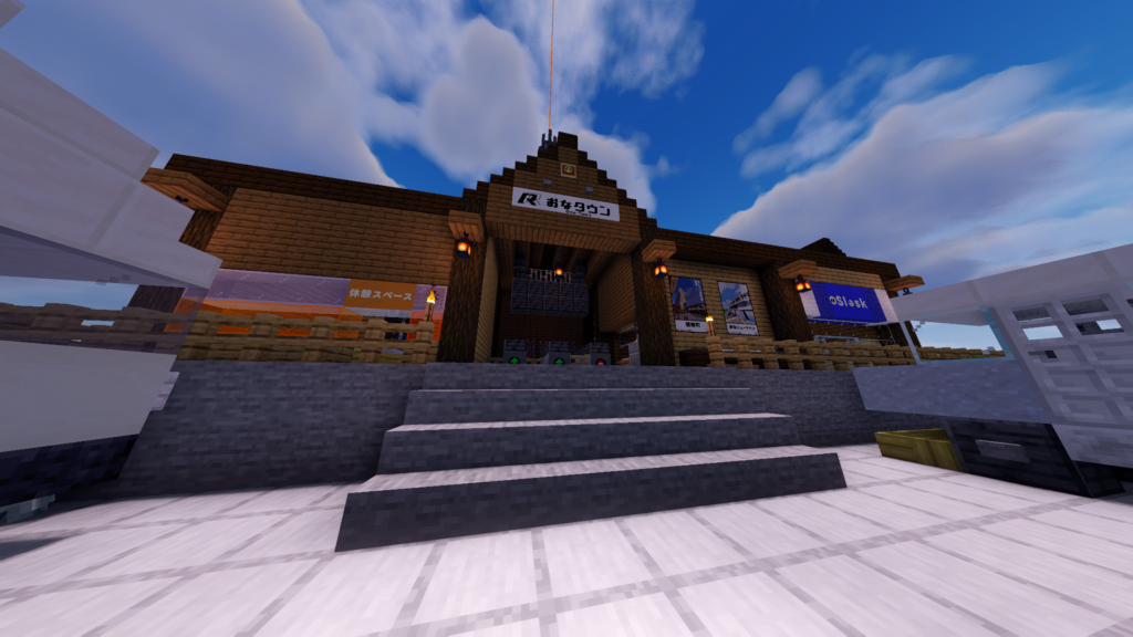 まずRRイマジン本線を利用し、最初に目に入るのは「おなタウン駅」です!木造で作られた落ち着きのある外観です。休憩スペースや売店「SLOSK」もあり、銅ゴーレムの駅員さんが歓迎してくれます。当初は田舎寄りの雰囲気にしたかったらしいのですが、まんクラ世界で3番目に大きいホームの駅になってしまいました(2026年2月現在)