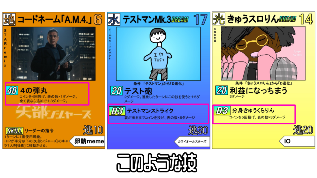 例えば「裏が出るまでコインを投げ続ける」「コインを3回投げ、全部表なら〇〇」のような運によって効果を発動できない場合がある技を安定させたり。「コインを2回投げ、表の数×〇ダメージ」といった威力にばらつきのある技をできるだけ最大火力に近づけたりすることができます。あるとないとでだいぶ勝率変わります!