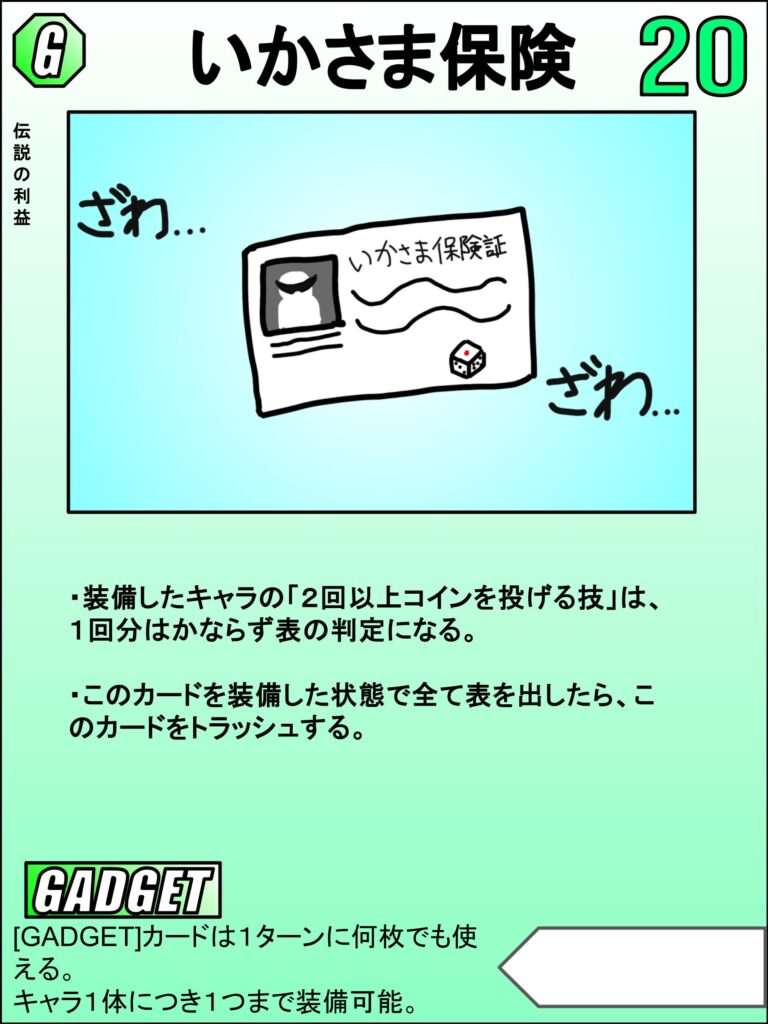 21DREAMの項目で紹介したやつです。こちらは「GADGET」と呼ばれるキャラに装備させるサポートカードです。このカードの効果は記述通り「コインを2回以上投げる技は、1回は必ず表の判定になる」というものです。これの何が強いかってやっぱり「安定性を向上させる」事ですね。