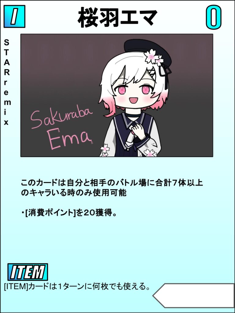 発動条件的に使うのは後半戦で、両者合わせてバトル場に7体キャラがいると使えるので、両者は桜羽エマ使用を読んで6体にとどめることもあります。入れといて損はないカードなので使用率がかなり高いです。