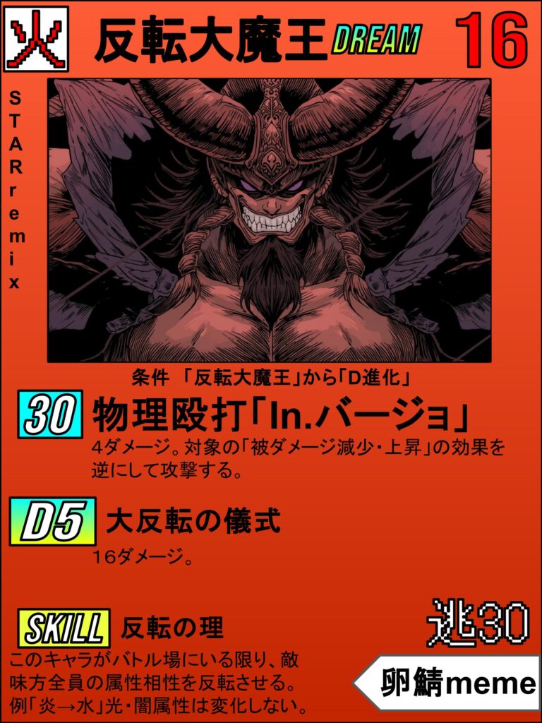 こいつは「STARremix」パックのDREAMキャラです。名前は反転大魔王といい、ありとあらゆる事象を”反転”させる能力を持つ大魔王です。その能力の通りこのキャラは「場にいるだけで属性相性を反転させるSKILL:反転の理」を持っています!DREAMスターライトの属性相性は「火⇒氷⇒風⇒地⇒雷⇒水⇒火…」というローテーションになっており、「火は氷に強い!」や「水は雷に弱点を突かれる!」みたいな感じが普通なのですが、反転大魔王DREAMが場にいるだけで属性相性のローテーションが「火⇐氷⇐風⇐地⇐雷⇐水⇐火…」と反転してしまうのです!