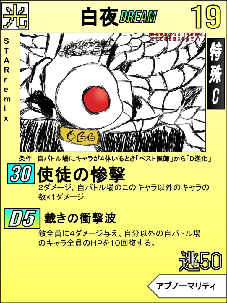 ますHP19と高水準。そして「通常技:使徒の惨撃」は味方の数分ダメージが増える技になっており、白夜DREAMの進化条件を満たすためにすでにバトル場が埋まってるので実質進化したらすぐに最高火力の5ダメージを出せます。