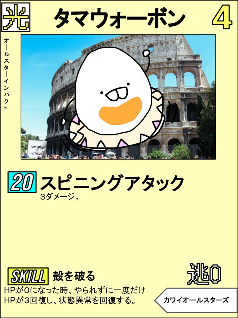 ちなみに1周年時点のカード501枚の中で、「コインを投げてダメージ変動」や「特定条件下でダメージ増加」という効果の技を除いて敵単体に19ダメージ以上を素で出せるキャラは他に「オーバーアーマード・メカクマ」くらいです。恐ろしい…