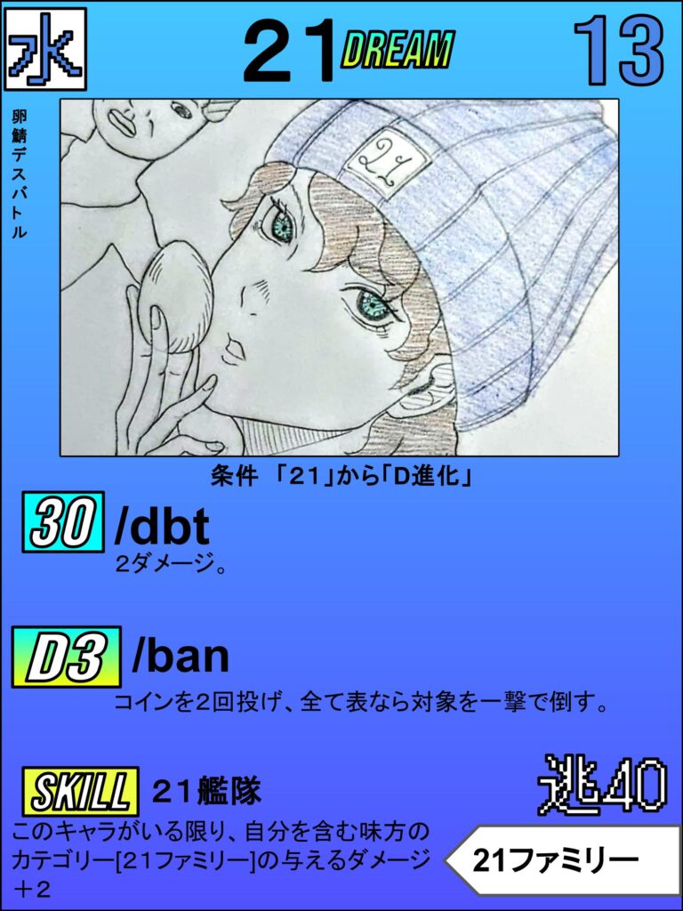 皆さんおなじみ。卵鯖の創設者、卵の権限の創設者、ケツネットCEO、天性のケツと様々な肩書を持つ「21」です。もう長く語る必要はありません!このカードの強みは「DREAM技:BAN」にすべて詰まっています!そう!「一 撃 必 殺」です!25%の確率でどんなに体力が多いキャラも、どんなに固いシールドを持っててもワンパンします!もうこれだけです!これがクソ強いんです!